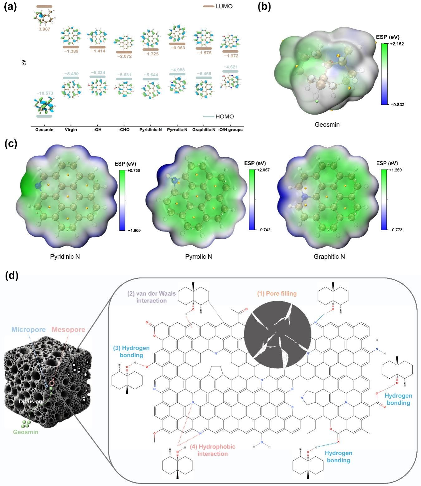 團隊合成了N摻雜/KOH協同合成的廢棄青苔生物炭用于吸附去除土臭素并揭示其吸附機制。采用氨水熱處理與KOH活化聯用策略構建了氮摻雜分級多孔結構,用于高效吸附土臭素。在模擬與實際水體中均表現出優良的吸附容量、循環利用和適用性。結合表征技術與密度泛函理論計算,研究明確了關鍵吸附位點及機制,為開發生物基吸附劑去除養殖水體和其他水體異味物質提供了可持續的新途徑。