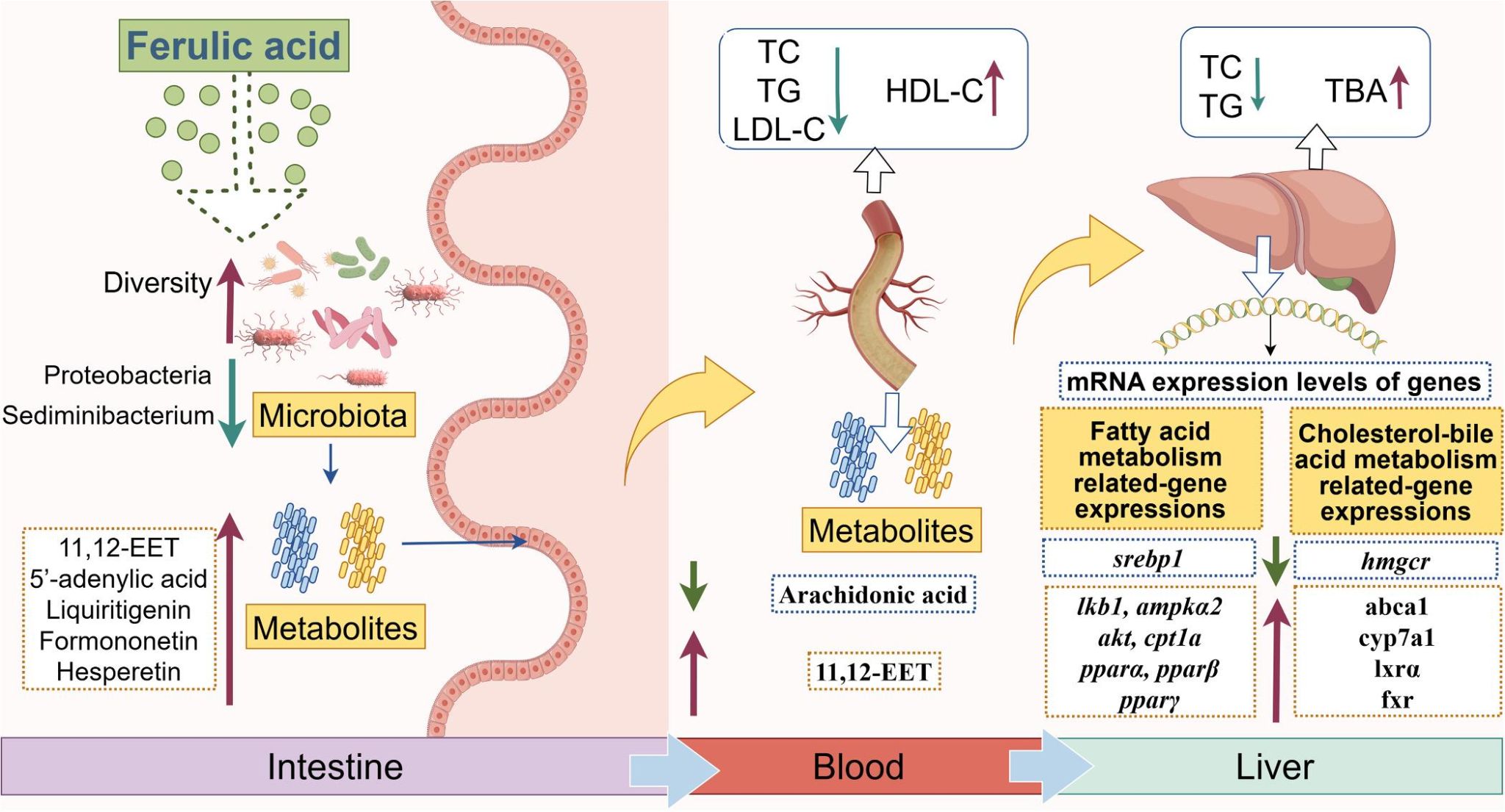 阿魏酸(FA)是一種在植物界普遍存在的羥基環肉桂酸衍生物,具有清除自由基、提高抗氧化性能、抗炎性能以及降低血脂的生理作用。團隊前期研究表明,植物提取物阿魏酸能夠提高團頭魴生長性能、抗氧化和抗炎性能,降低細胞凋亡水平,維持肝腸內質網穩態。本研究聚焦探討阿魏酸經“腸肝”軸影響團頭魴脂質代謝的機制,發現阿魏酸通過影響腸道菌群結構,提高腸道和血漿中脂質代謝相關小分子物質的分泌,促進膽固醇轉化為膽汁酸,抑制脂肪酸和膽固醇合成,進一步在脂質代謝調節中發揮關鍵作用。